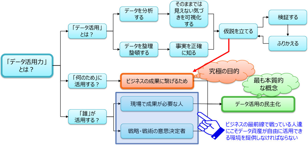データ活用の目的はビジネス貢獻です。ビジネスへの貢獻を最大化するためには、事業活動の最前線である現場においてどれだけデータ活用が浸透しているかがポイントとなります。重要なのは高度なデータ分析スキルやIT専門要員しか扱えないデータ基盤ではありません。現場を中心に幅広くデータリテラシーを習得し、最前線でデータを武器として戦える裝備を整え、データを必要とする人が、必要なデータを必要な時に、安全に利用できる環境を実現することこそ、データ活用によるビジネス貢獻につながると考えています。