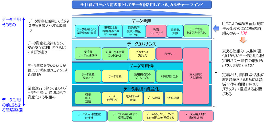 日常的に現場でデータが活用される狀態は、現場のデータ活用力を向上させる施策だけでは実現できません。必要な時に必要なデータが利用できる、安心安全に利用できるという前提が必要ですし、そもそもデータが集積され利用可能なデータ資産として整理されていなければなりません。