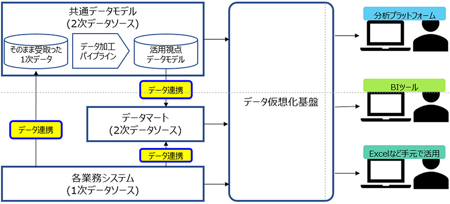 現場でのデータ活用を促進する上での大きな阻害要因の一つがデータ取得の煩雑さです。現狀では活用したいデータを入手するためには必ずデジタル戦略部擔當者へのデータ取得依頼を申請する必要があり、取得したいデータの內容によっては依頼をしてから申請者の手元にデータが屆くまで時間を要するケースもあります。現場でデータを活用したい人が、活用したいデータを、活用したい時に入手できる環境の実現を目指してデータ仮想化基盤を中心としたセルフサービス化の仕組みを導入しました。今後はセルフサービスの対象となるデータを段階的に拡充し、データ活用の裾野を広げていく取り組みを後押しします。
