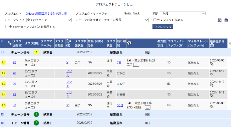 2024年度に完了したプロジェクトは525件でした。各プロジェクトでは、進行中に確保されたCCPMバッファ(余裕期間)の消費狀況を色分け(緑=安全、黃=警告、赤=危険)によって早期解決につなげています。