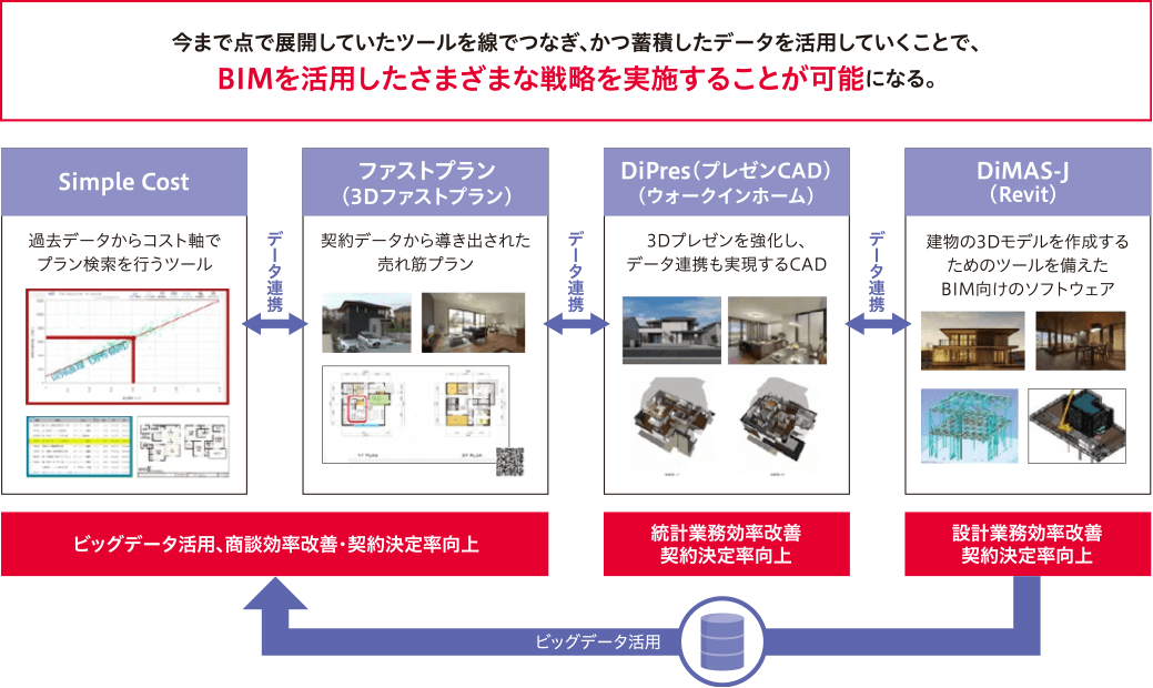 BIMによる事業DXの実現に向けて住宅系事業では、BIMデータを顧客情報およびものづくり情報と一元化することで、BIMデータの高度活用と競爭優位性の確立を目指しています。BIM導入前は、仕様データとCADデータとの整合性をとるために「同期処理」が必要でしたが、現在はBIM対応の3次元CAD(Revit)をベースに3Dモデルと仕様データを統合したBIMデータとして運用活用しています。