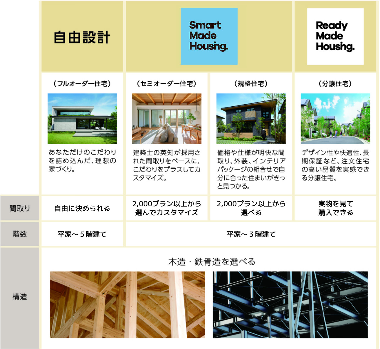 自由設計、セミオーダー住宅、規格住宅、分譲住宅。