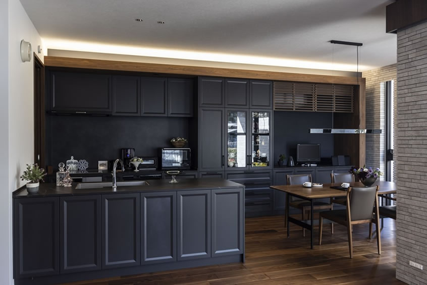 ダークトーンの面材は框入りにして動(dòng)きを持たせ、軽やかなイメージに