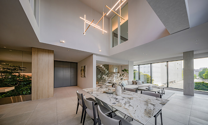 ダイニング上部の吹き抜けには、直線的でモダンなペンダント照明を配置し、軽やかさと華やぎを添えました。大理石調のダイニングテーブルを中心に、白を基調としたインテリアで全體のトーンを統一。シンプルな構成の中に素材の個性を引き出し、建築とインテリアのバランスを丁寧に整えることで、開放感と靜けさを兼ね備えたLDKに仕上げています。