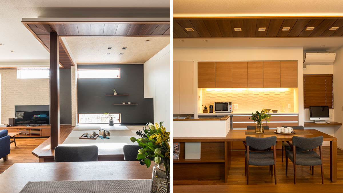 1階の中心=リビングとダイニングキッチンの間に據えたのは、シックな黒の塗り壁や琉球畳によって現代風にデザインした和の空間です。床のレベルを約40センチ上げることで、リビングにいる家族と視線が交わり、1階全體に一體感が生まれます。高窓と地窓から光を適度に取り込みつつ、隣地の景色の見え方にも配慮しました。