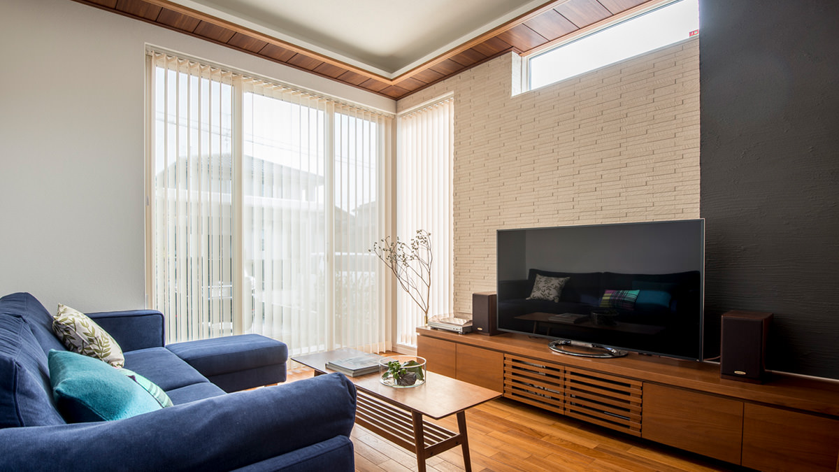 バーチカルブラインドから差し込む光がリビングに美しいストライプを描くよう設計。室內にいながら、四季の移ろいを感じることができます。また、リビング、キッチン、畳コーナーに木の化粧天井を連続して配置しました。間接照明のやわらかな光が空間全體を包み込みます。