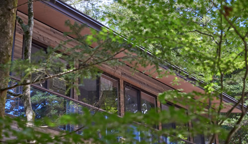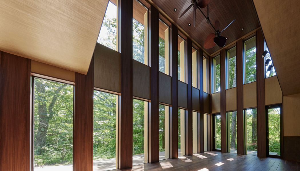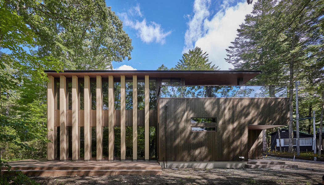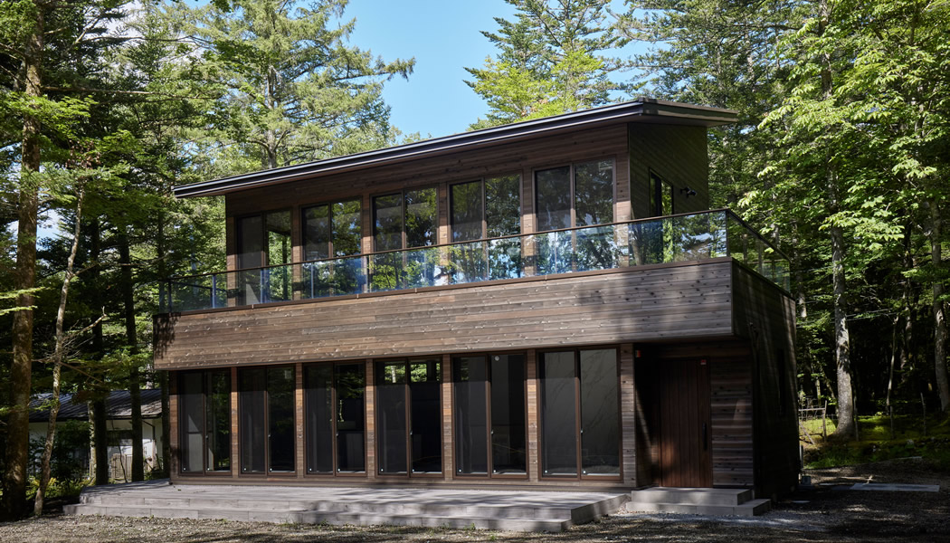 避暑地である別荘地に木々に囲まれて佇む2棟のVilla。木製外壁により周りの景色に溶け込むよう配慮し、近隣別荘のみならず2棟の存在感がお互いに邪魔にならないよう配置位置や角度までデザインしている。