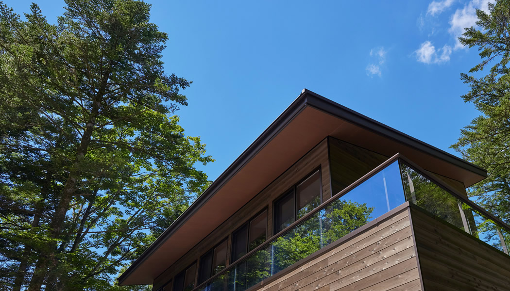 効かせたエッジ:エッジの効いた軒先で空を切り取り、バルコニーのガラス手摺が緑を寫して美しく映えている。