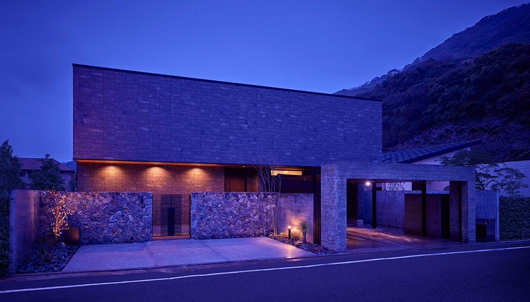 夜景:夕暮れ時、割肌の石塀がライトアップされ、より豊かな表情を醸し出す。軒天の照明が家族を優しく迎えます。