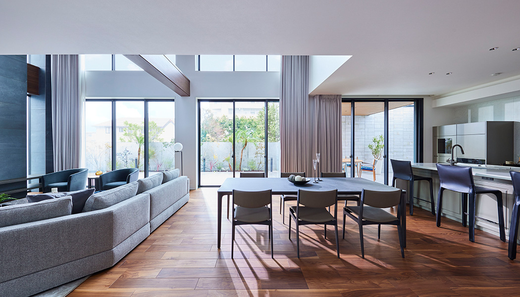 近くには緑豊かな山並みと靜寂な街並み。その風土に調和したものは何かを考えデザインした「靜」の外観。內部には、家族の「動」を大切にした明るく開放的な空間が広がる。