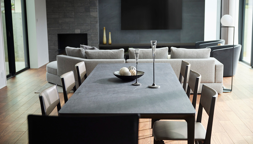 コーディネート:ウォルナットの床にブルーグレーの大判タイル壁。上質で多彩なマテリアルをグレートーンでまとめました。