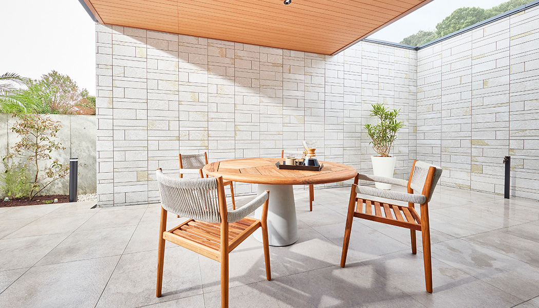 軒のあるテラス:壁に囲まれたキッチンサイドのテラス。隣家に気兼ねなく、ゆっくりとくつろげる居心地の良い場所です。