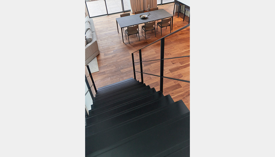 階段:上下をつなぐスケルトン階段。アイアン手すりとマットブラックの段板はオブジェのようで空間のアクセントに。