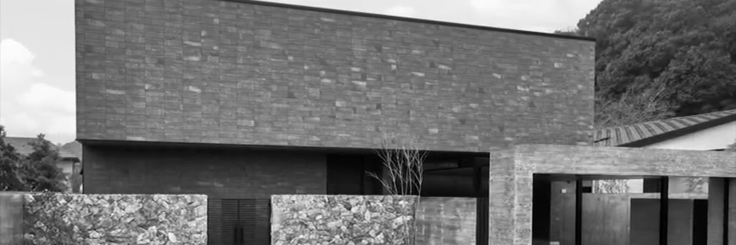 外観:タイルで裝った直方體をキャンチレバーで持ち上げた構成。割肌の石塀と杉板打ち放しの門型で街の風景に調和するようにデザイン。