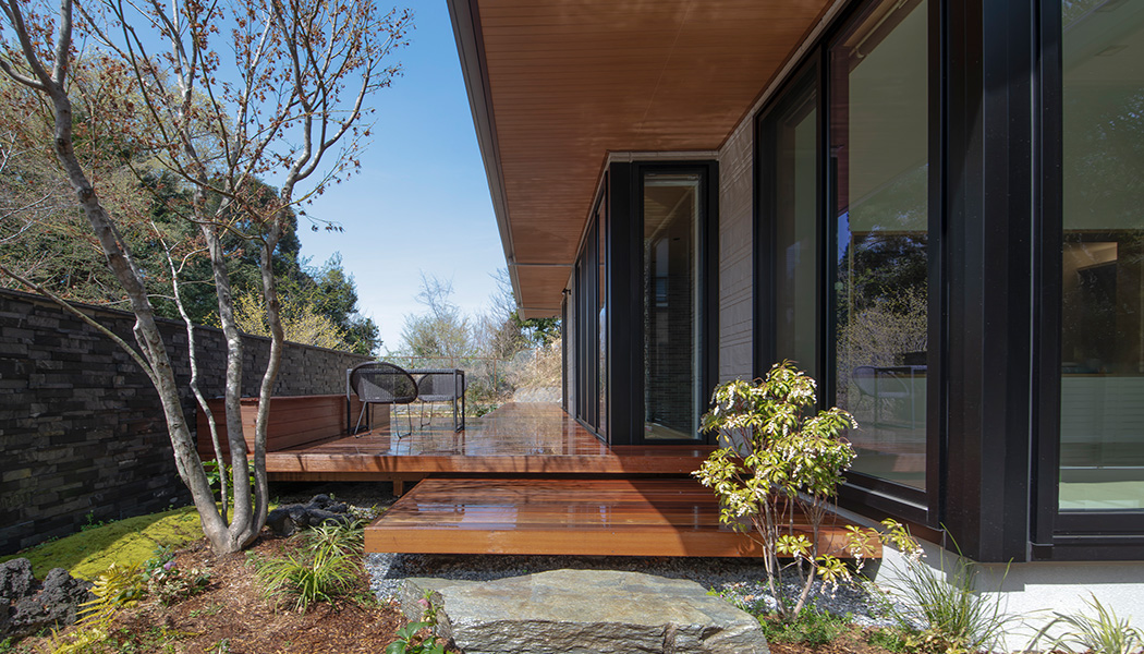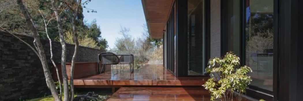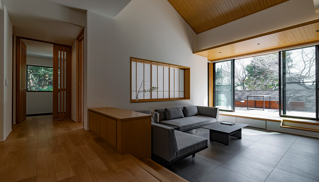 都會から自然豊かな土地へ移住する熟年夫妻の住まい。主庭の桜を軸に視線を誘導し、大地になじむ暮らしを意図して軒下デッキを大膽に施した。內部は床を埋め込みつつ天井をせり上げ、切り取られた外界を眺められる趣向に。包まれながらも開放感がある、根源的に安らぐ空間を特徴としている。