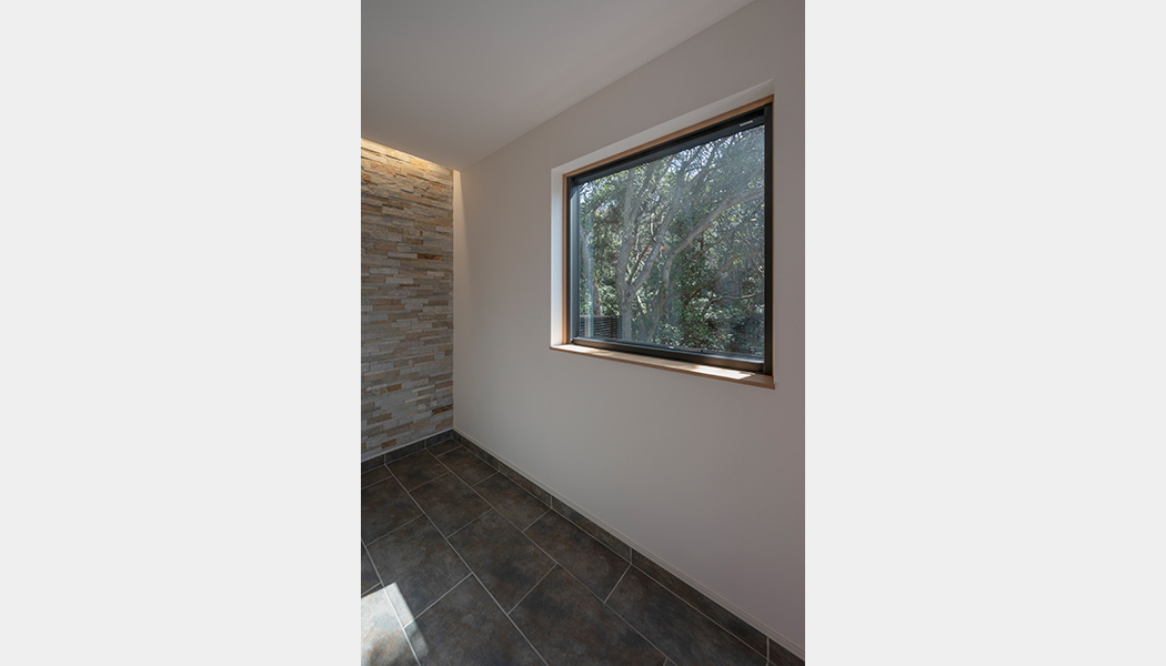 玄関:緑を切り取り內裝で自然石を添えたエントランスは、朝日を感じる心地よい空間に。