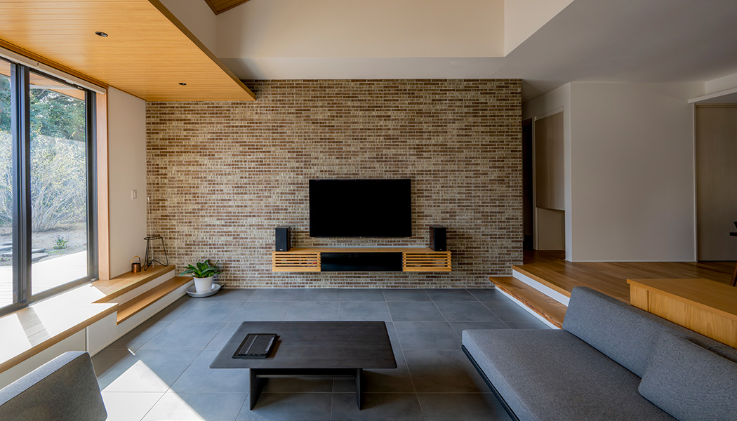 リビング:床を埋め込み天井をせり上げた空間は、包まれながらも開放感がある居心地をもたらす。