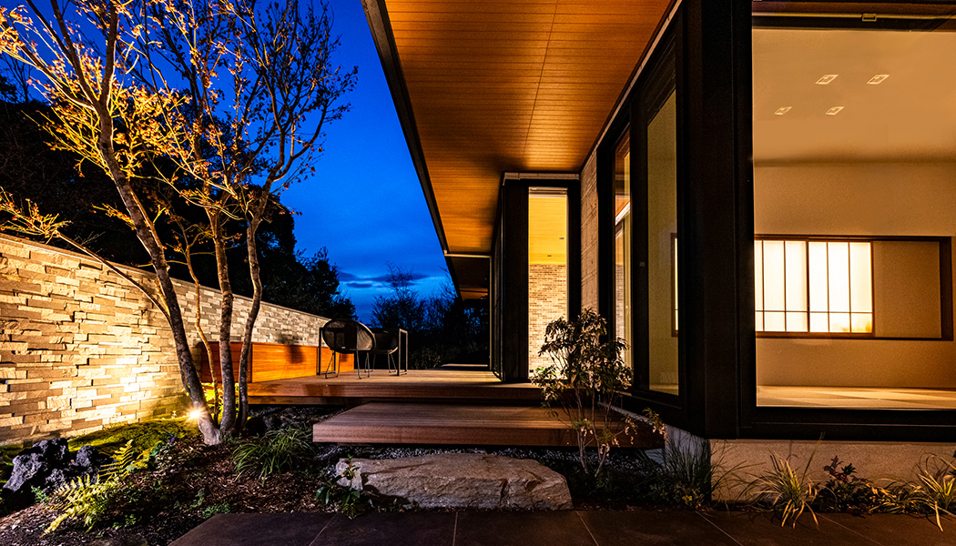 夕景:視線を遊ばせる前庭は、葉裏をライトアップしてほのかにアプローチを照らす趣向。しっとりと落ち著く住まいを目指した。
