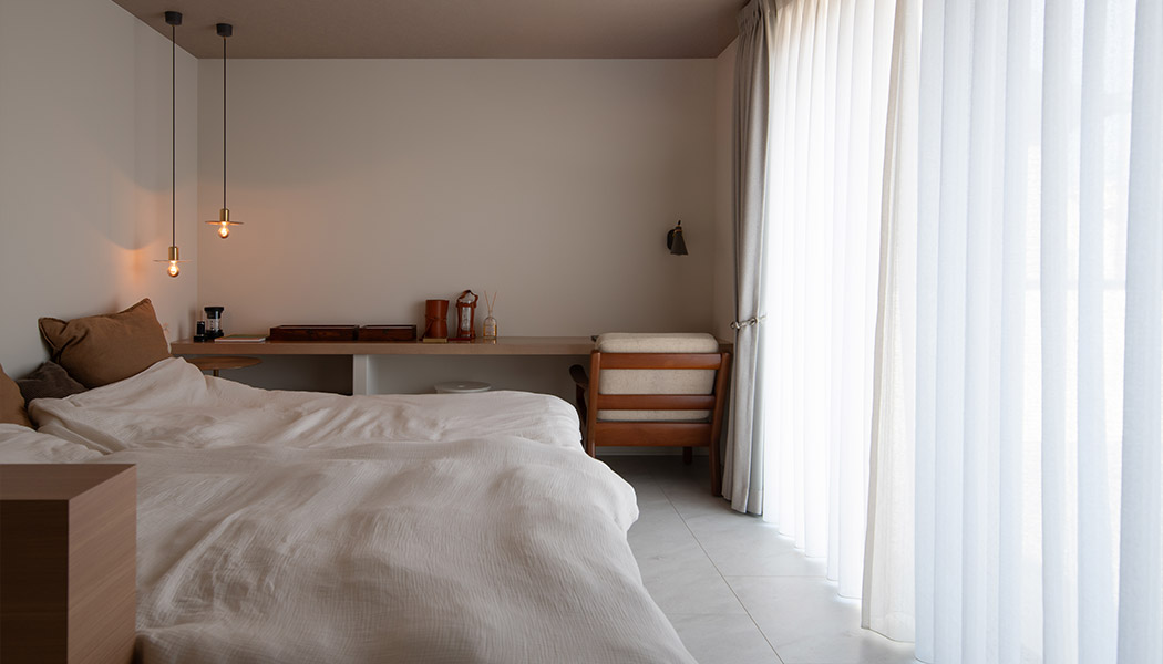 寢室:柔らかな光がそそぐ、心地よいくつろぎの場所。