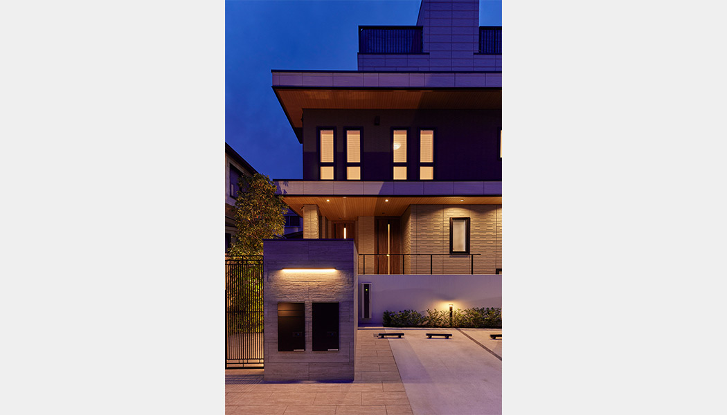 住み慣れた土地の記憶を殘しつつ、新たな暮らしを描いた二世帯住宅。世帯ごとの好みを反映しながら全體として調和し、ご家族の器=フレームとなる住まいを目指した。浮遊感のある個性的な外観を特徴としている。