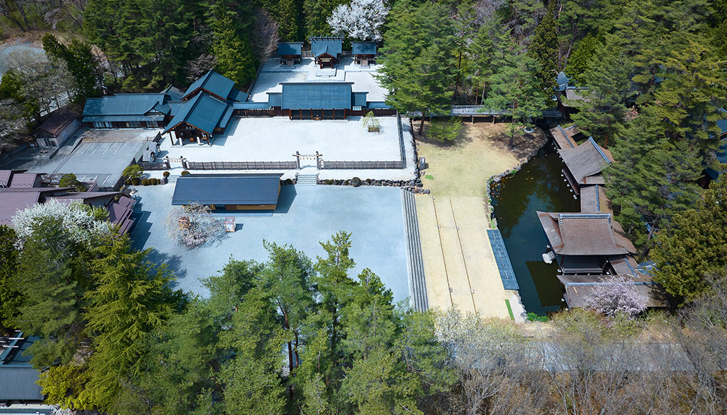 空撮:八ヶ岳の麓に厳かに鎮座する身曾岐神社。