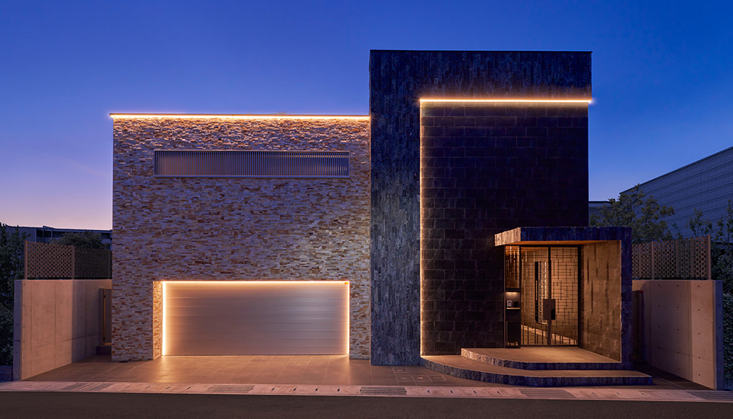 外部の開口を極限まで抑え、萬一の事態でも外敵をシャットアウト出來る間取りとした究極のセキュリティ住宅。マッシブでスクエアなデザインにライン照明を象徴的に使い輪郭を際立たせることにより、間取りに呼応した近未來的な外観デザインとしている。
