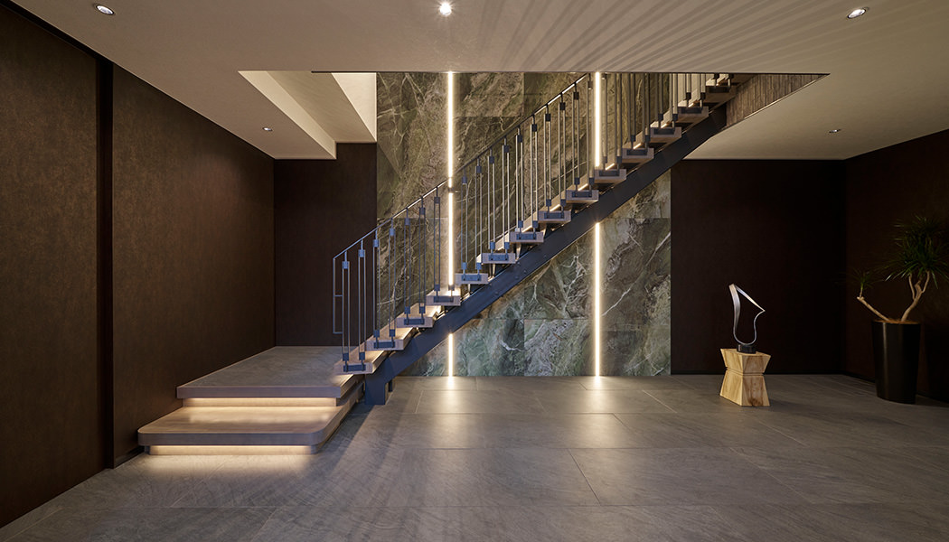 エントランス:外観と同じくライン照明を吹抜けに配し、上階への期待感を表現した。