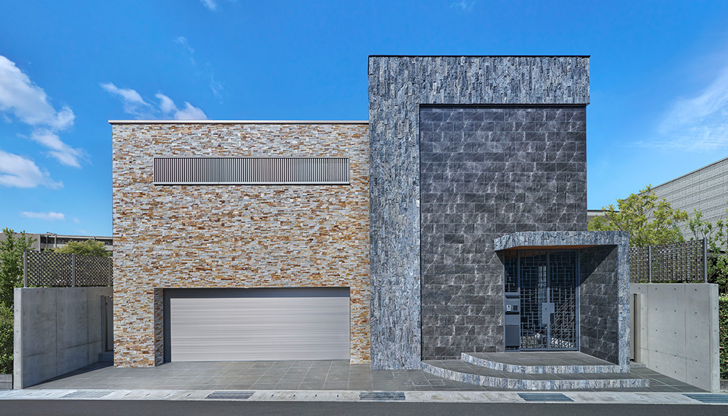 外観:外観中央にL型に配した石をあえて縦目にすることで、左右の箱の石とタイルの大きさが違うことが気にならない納まりとした。