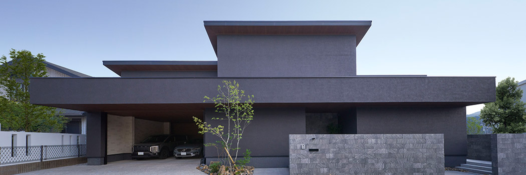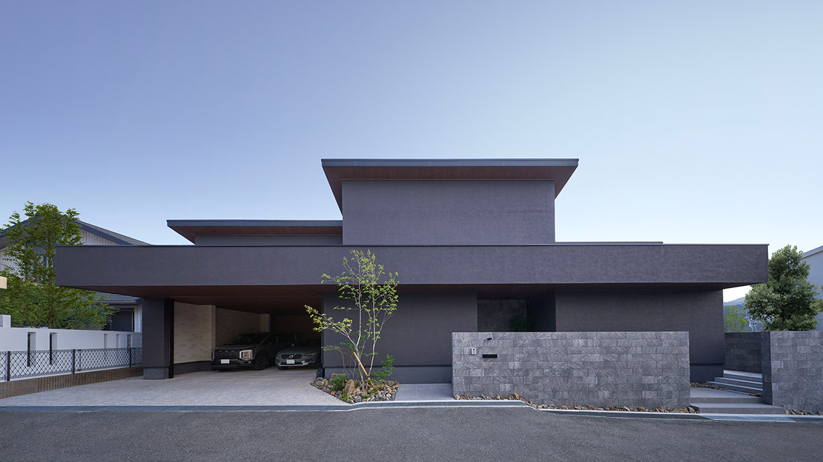 広い敷地間口を活かし伸びやかな水平ラインを強調したデザイン。中央を高くボリュームを構築し、雄大に裾野を広げる山々の稜線をイメージ。開口を排除したファサードはマッシブでモダンな印象を持たせながら、邸宅らしい優雅さを併せ持つ。
