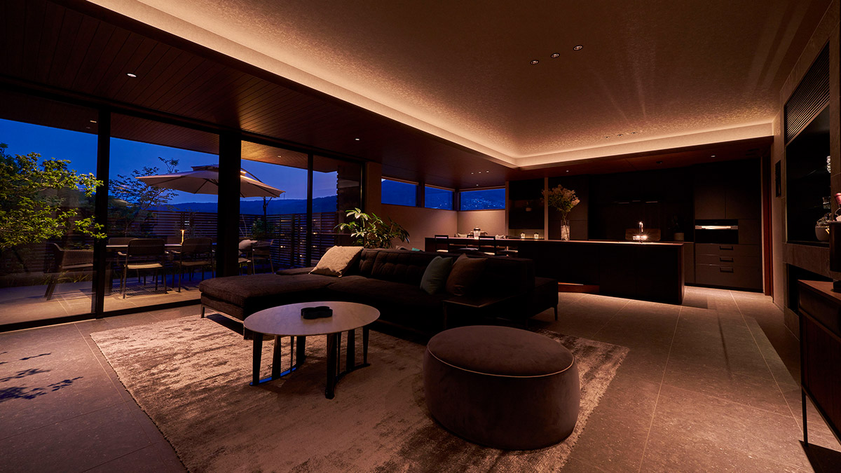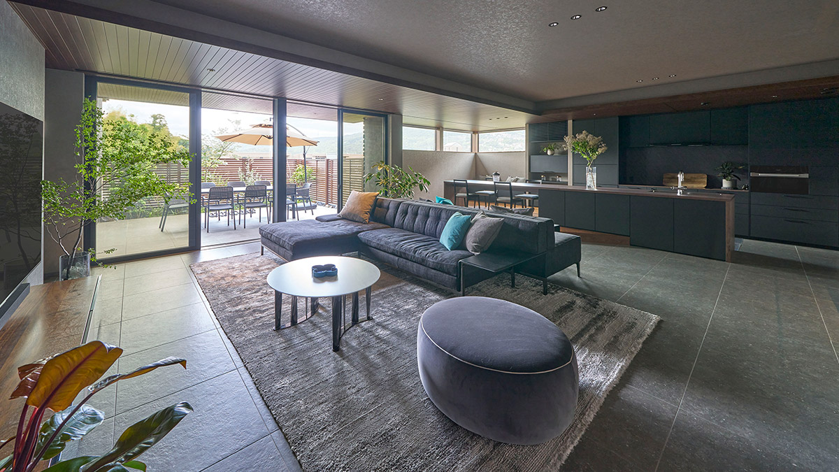リビング:ゆったりと時間が流れるラウンジのような空間演出。