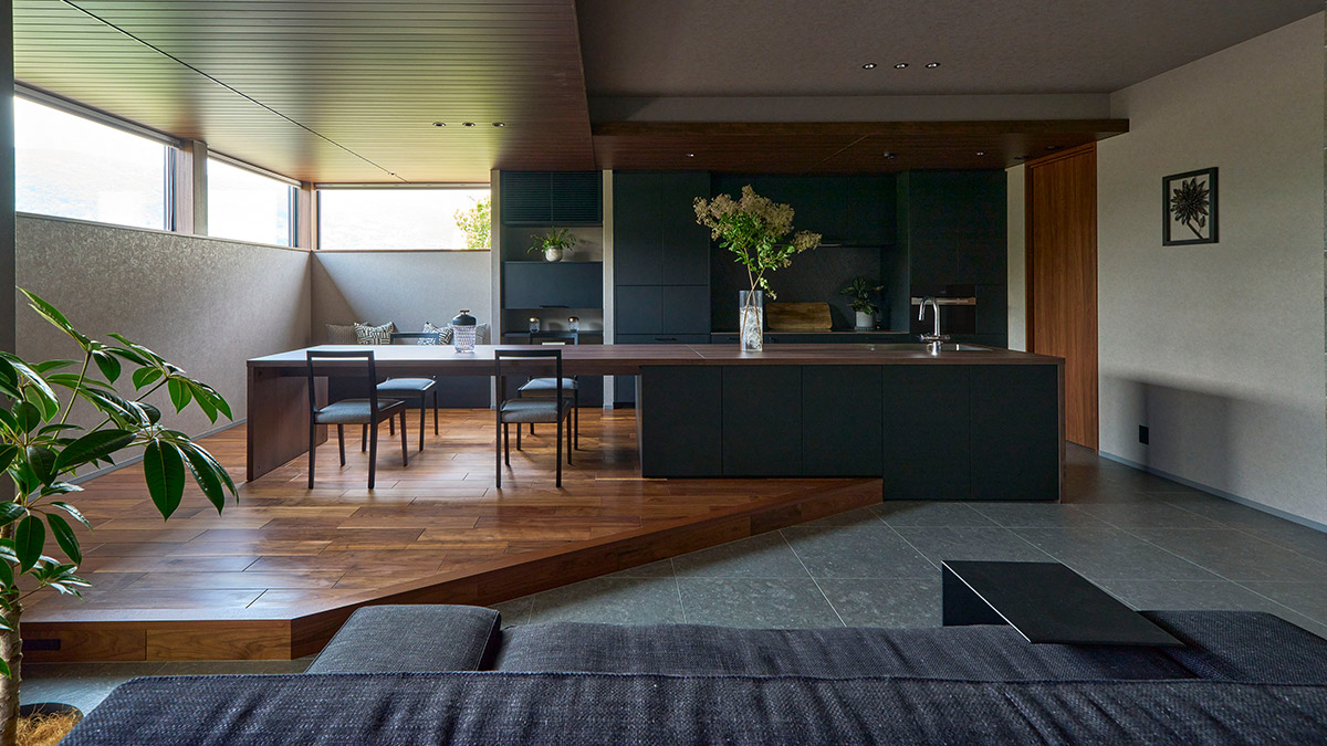 ダイニングキッチン:水平に伸びのあるキッチン。天井と床のレベル操作によってリズムのある空間に。