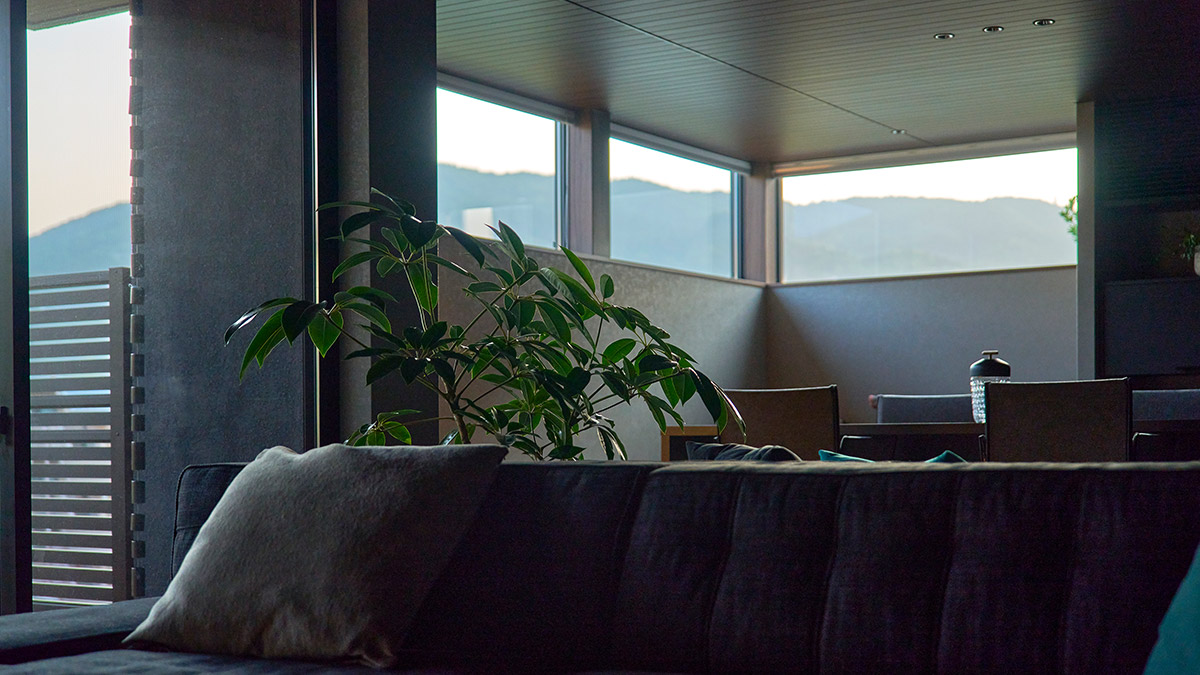 リビング:稜線を切り取りつつノイズを隠す開口計畫により、內外一體の開放的かつプライバシーに配慮された豊かな空間を創る。