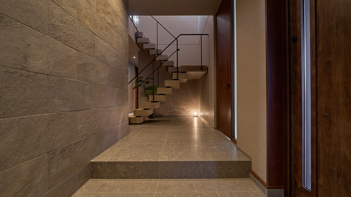 玄関:迫力ある階段を魅せるエントランス。吹き抜けから優しく光がそそぐ。
