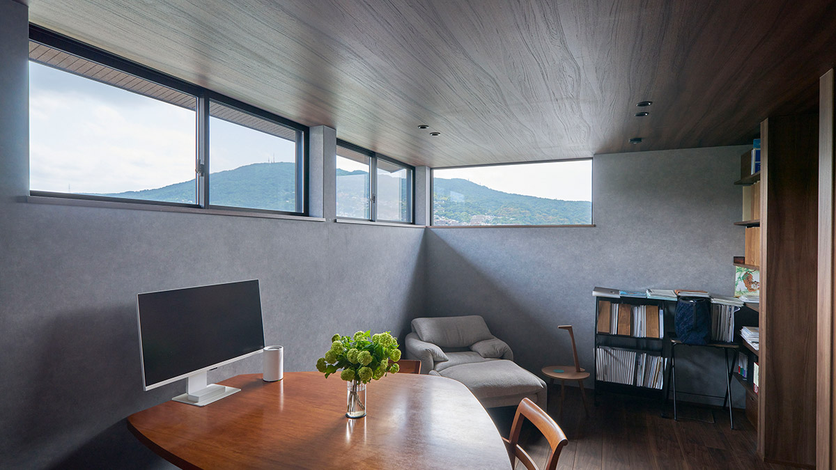ダイニング:ハイサイドライトにより稜線をパノラマに切り取る。