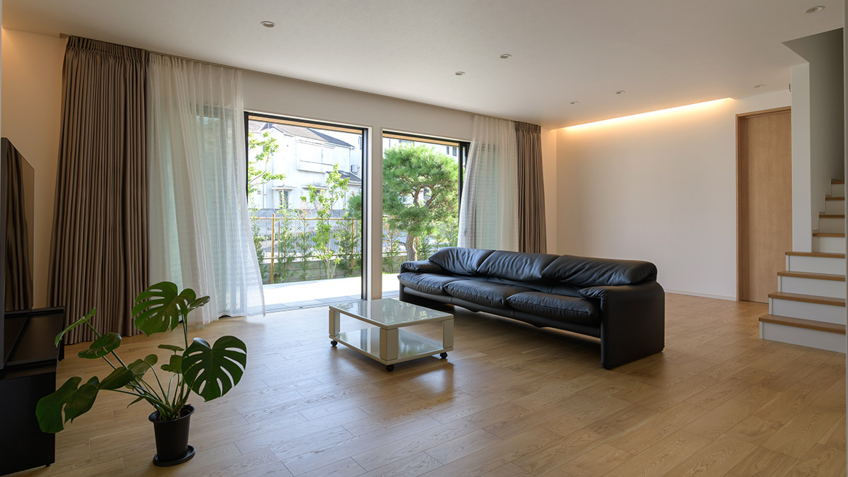 リビング:ダイニングキッチンからつながるリビングを介して庭の緑を愛でる。