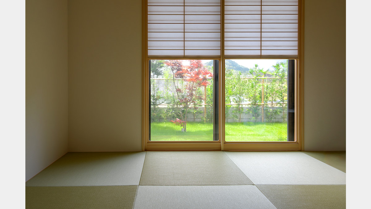 和室:シンプルな和室から雪見障子越しに緑を楽しむ。