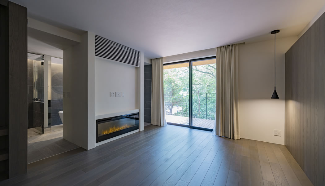 LDK:2FのLDK。暖爐を併用した造作収納(TV內蔵可)が美しい。面材はアッシュ板目。