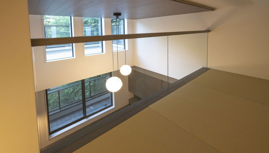 ロフト:畳敷のLoftからリビングを見下ろす。ガラス手摺を用いLoftにも開放感を與える。