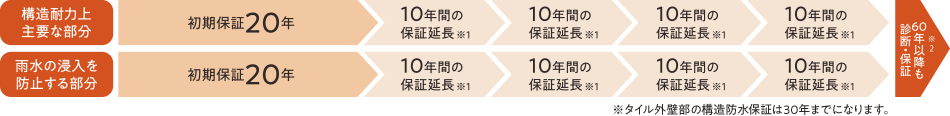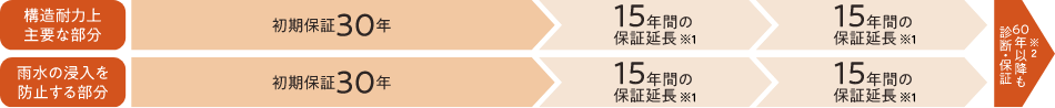 ※1:有料メンテナンス工事を?qū)g施 ※2:60年以降は、お客さまのご要望により、耐久性能調(diào)査(試験)を行い、耐久性能診斷書を作成します。また、部位ごとに必要な有料メンテナンス工事の項(xiàng)目と保証年限を提示します。耐久性能調(diào)査(試験)費(fèi)用は別途お見(jiàn)積りとなります。