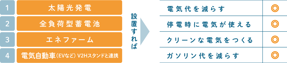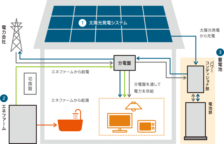買電だけでなく、①太陽光パネルと②エネファームでつくった電力を利用することで、毎日の電気をおトクに使える。