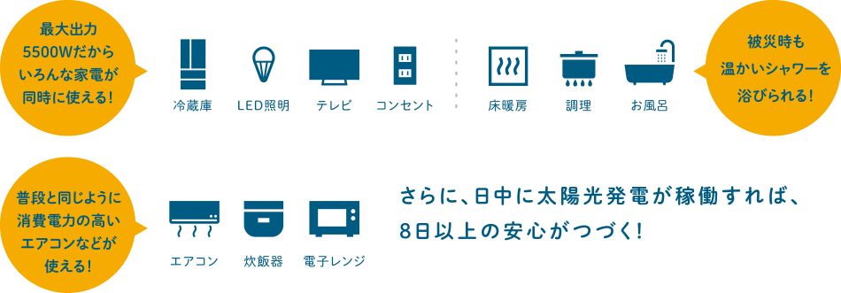 電気をつくる太陽光発電システムとエネファーム、電気をたくわえる全負荷型蓄電池の「3電池連攜」によって、雨天でも約8日分※2の電力と暖房?給湯を確保できます。