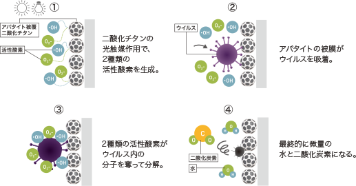 抗菌抗ウイルス壁材、コーティング全般に対していえることは、有害物質(zhì)などが直接觸れないと効果が発揮されませんが、「吸著性光觸媒コーティング」は、アパタイト被覆により有害物質(zhì)を自ら吸著し効果を発揮する點(diǎn)、かつ吸著効果が夜間も作用し続けることが最大の違いといえます。