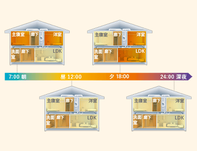 「エアヒーリング」や「エアサルーン」の導(dǎo)入によって、ゆとりある大空間はもちろん、洗面スペースや廊下などの非居室も、溫度ムラの少ない心地よさが24 時間365 日つづきます。