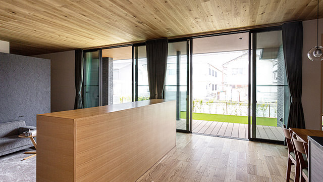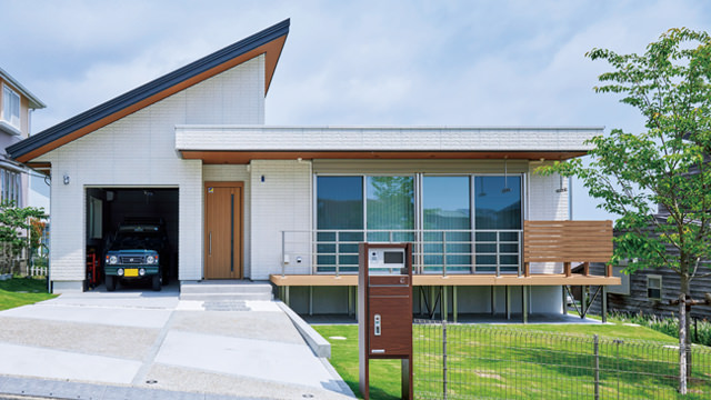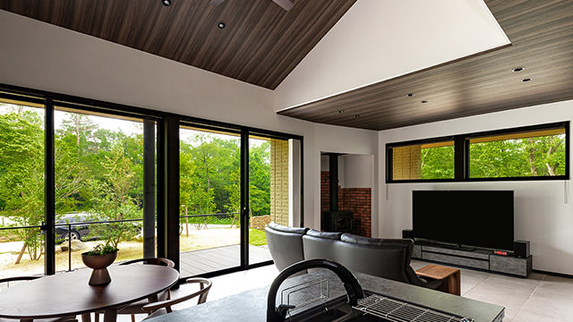 平屋の魅力は、ソトとウチが近いこと。大開口の窓からは、庭に植えた花や緑の香りが室內へ。揺れる日だまりや靜かな雨の音も身近に感じられます。リビングの延長にアウトドアデッキを設ければ、室內から庭までがひとつづき。深い軒が日差しをさえぎり、心地よい軒下空間でくつろげます。