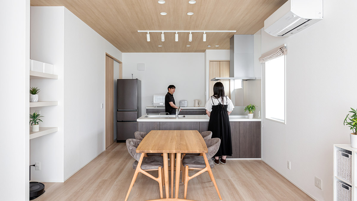 xevoΣの技術や、大手ハウスメーカーの長期的な安心感から、大和ハウスに魅力を感じられたTさま。Smart Made Housing.の、プロが提案するベースプランをカタログのように眺めながら、「ファミリークローゼットが1階にあるのは便利」や「洗面臺はもうちょっと広い方がいい」など、ご家族の生活に合った間取りを検討。さらに、上下に木目を施したLDKのインテリアをはじめとする、多くのこだわりが詰まったご新居を建てられました。「2人ともワクワクしながら、食事中に『ここはどうしようか』と相談したり、資料を眺めて『これいいよね』と期待を膨らませたり、とても楽しい時間でした」と、家づくりを振り返るTさまです。