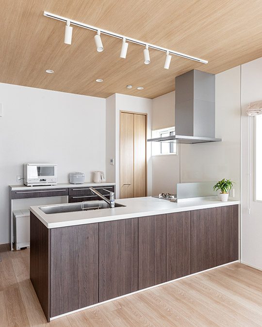 白とライトカラーの木目をベースとする明るい內裝に、ダークカラーのキッチンがアクセントを加えています。また、照明はダクトレールとスポットライトを組み合わせたことで、位置や向きが調節可能。家具の配置や用途に応じてフレキシブルに使えます。