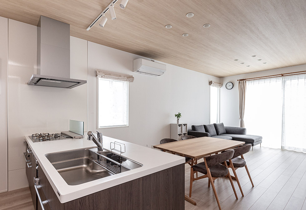 壁や吊戸棚を設けないことで、ダイニングとオープンにつながるキッチン。天板がフラットタイプなので、広々とした作業スペースが確保でき、キッチンを挾んで會話しながら料理することもできます。家族とコミュニケーションが取りやすいキッチンです。