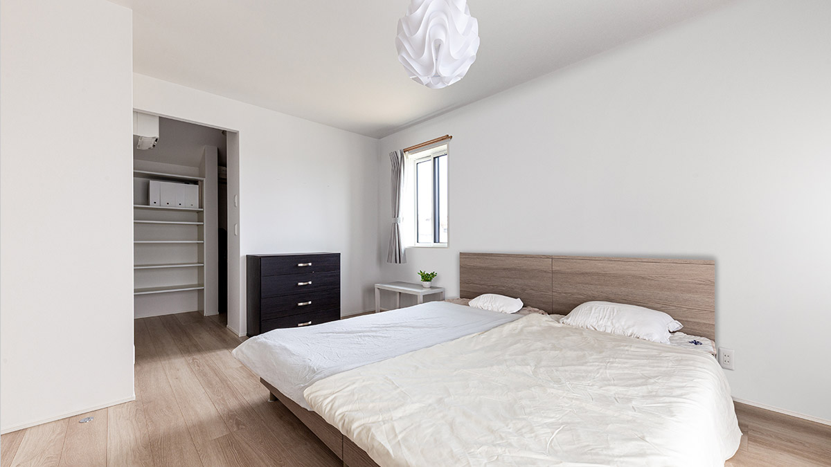 主寢室は大ぶりのペンダント照明が主役の明るい雰囲気です。ベッド2臺を配置してもゆとりある、広々としたスペースを確保。奧のオープン棚右手には、ウォークインクローゼットが扉なくつながり、一層広さが感じられます。