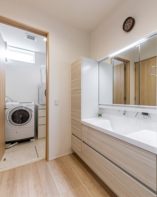 洗面臺と天井付け物干しを設置したユーティリティ。二人で並んで使える幅広サイズの洗面臺は、忙しい朝の準備に便利です。「天井が高いので、洗濯物を吊っていてもシャツ程度のものであれば邪魔になりません」とTさま。