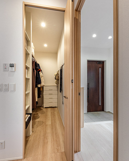 玄関のすぐ橫に位置するファミリークローゼット。帰宅後はすぐに上著やスーツをかけられます。また、洗濯スペースや浴室と同じ1階に設け、動線を一直線にしたことで日々の著替えや洗濯がスムーズ。階段上り下りの生活負擔が減らせます。